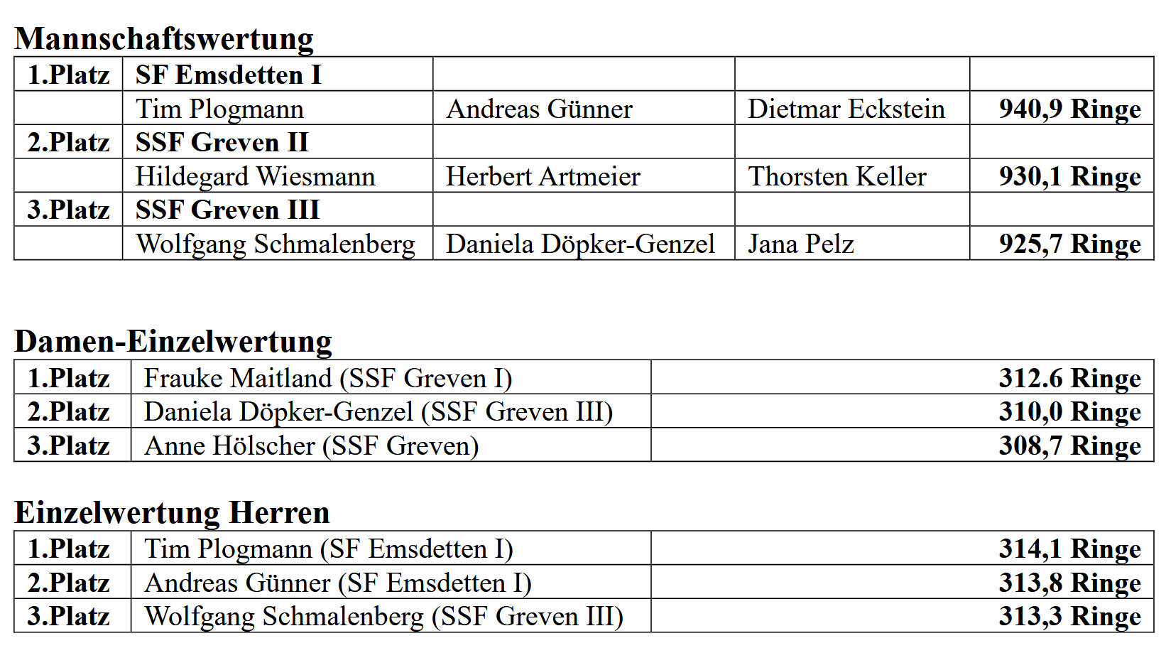 In einem äußerst knappen und spannenden Finale der Kreisliga Luftgewehr konnte sich die Mannschaft Emsdetten IV den diesjährigen Pokal erobern. Platz zwei ging an Emsdetten V, Platz drei an den BSV Saerbeck-Dorf und Platz vier an VSS Neuenbkirchen III.